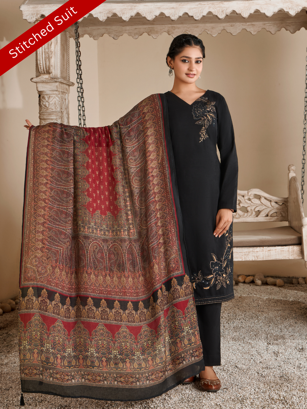 Deep Grey Pashmina Embroidered Stitched Suit Set with Shawl