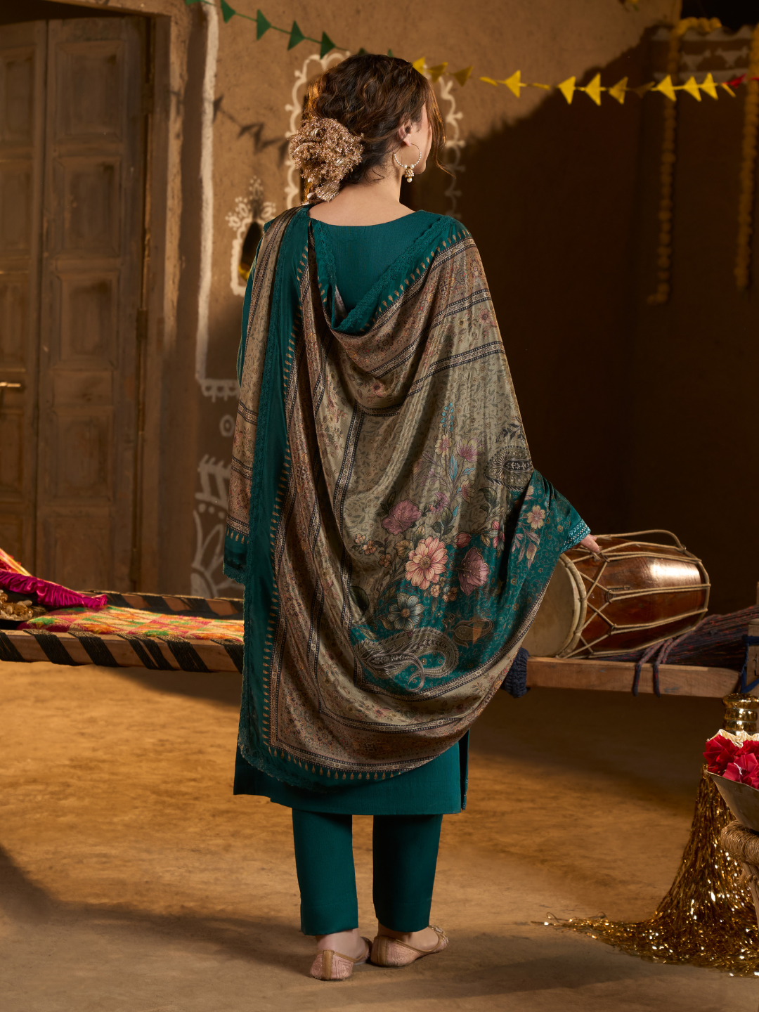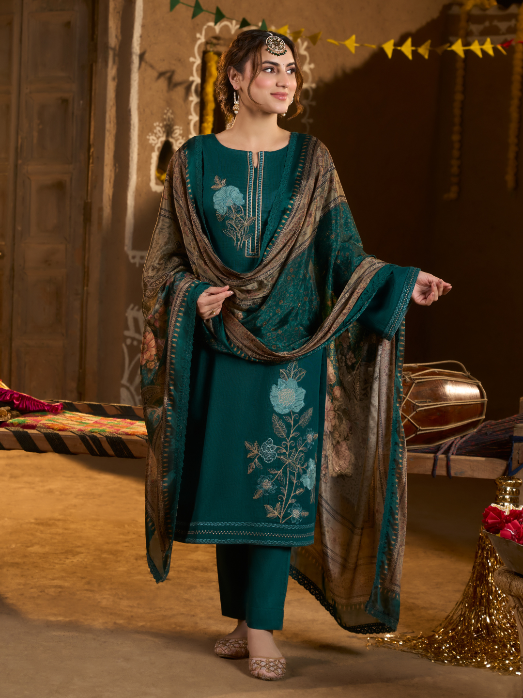 Dupatta: A stunning blend of chinon printed dupatta with bordered lace on all four sides. (Length: 2.40 meters)