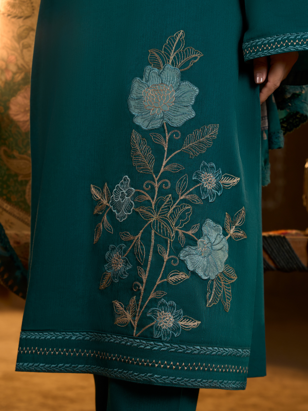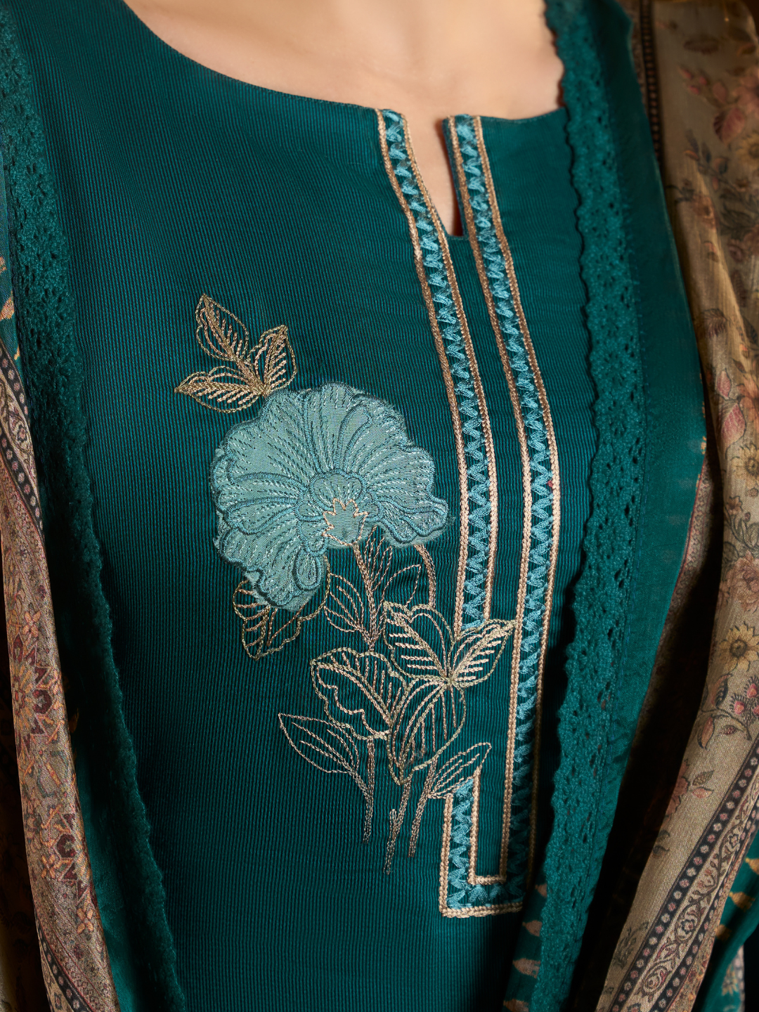 Shirt: Glace cotton fabric featuring stylish patch and hand embroidery on the front. (Length: 2.50 meters)