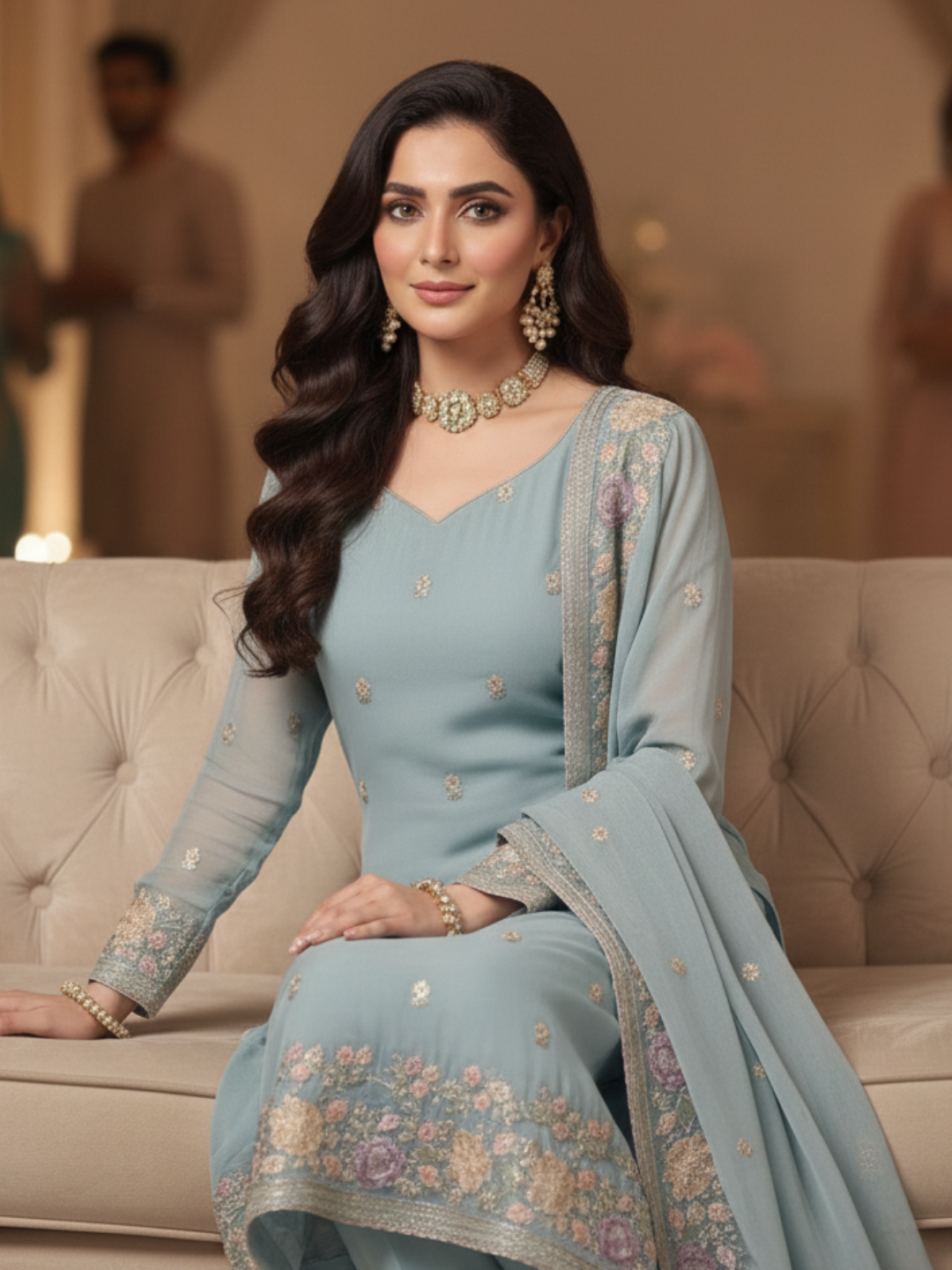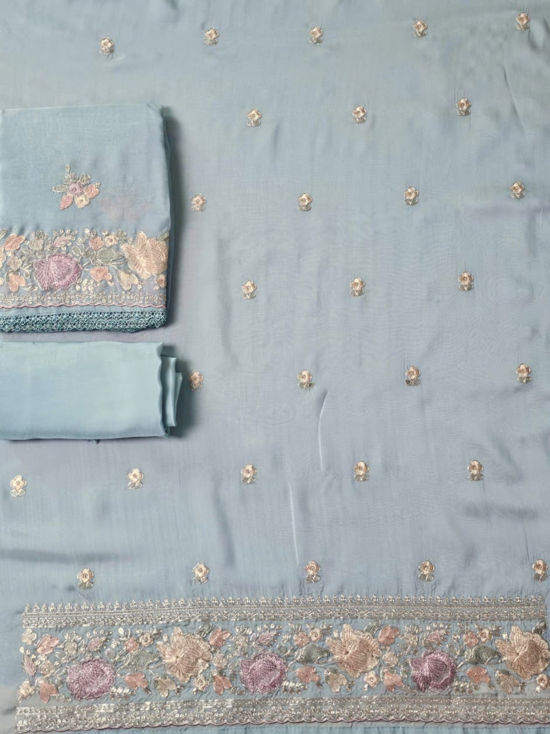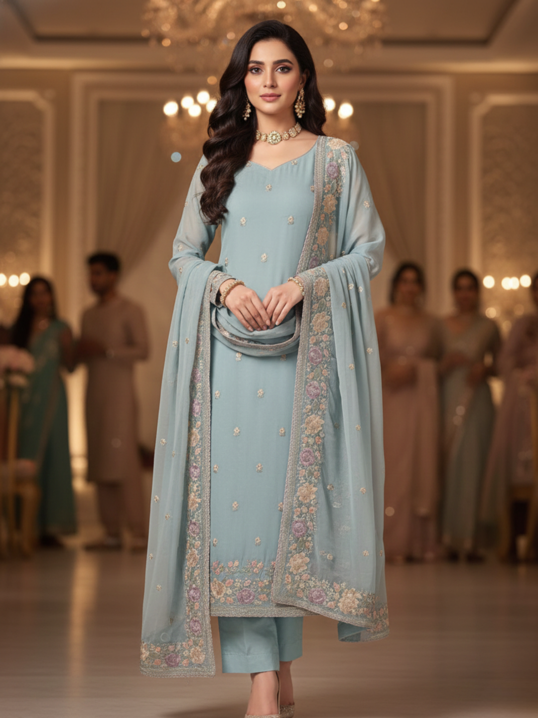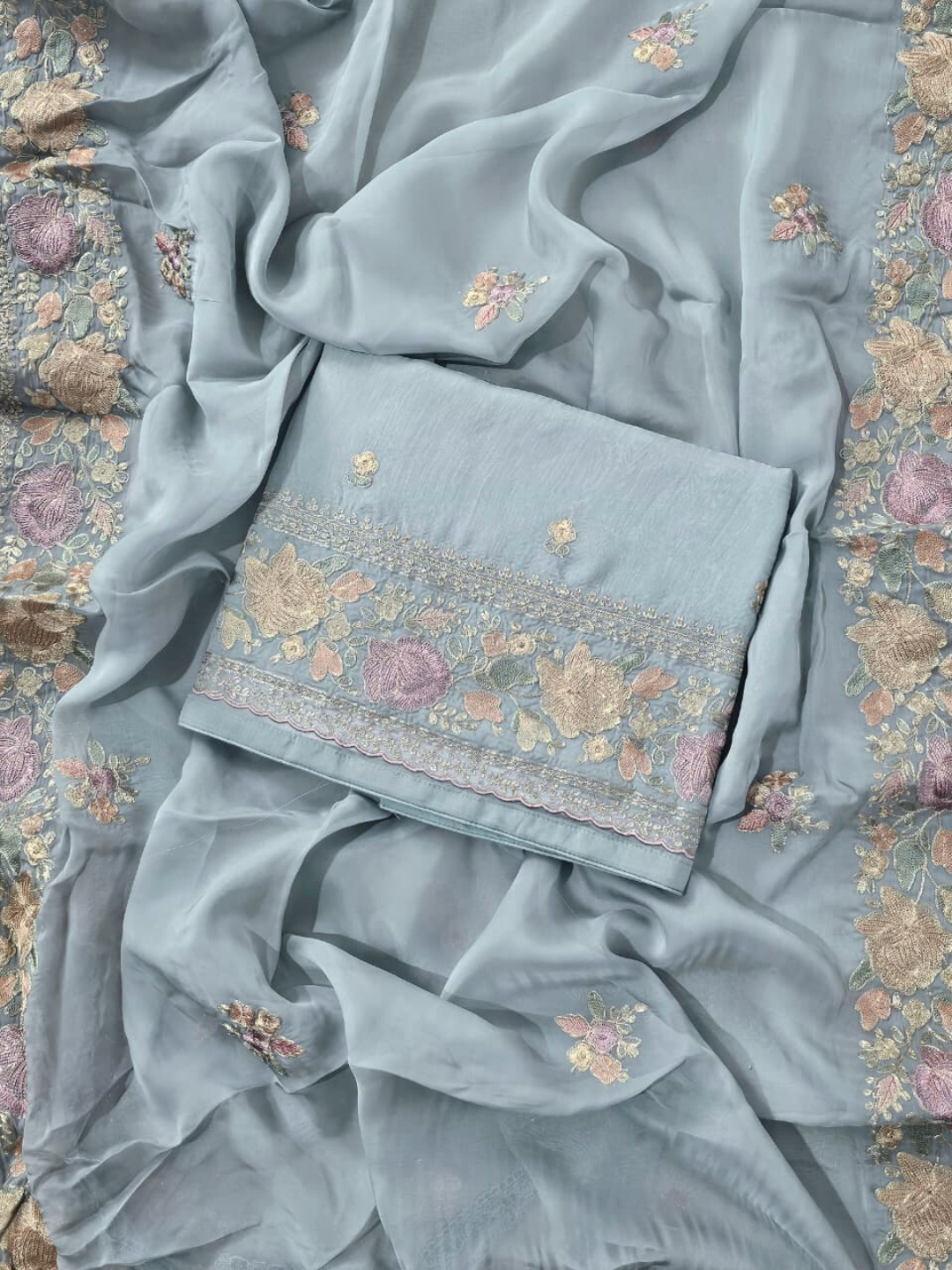 Aqua Green Multi-Embroidered Organza Party Wear Suit Set