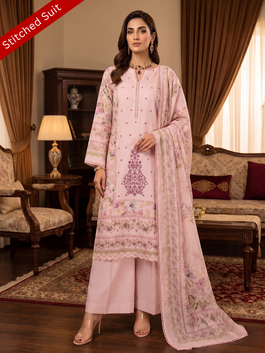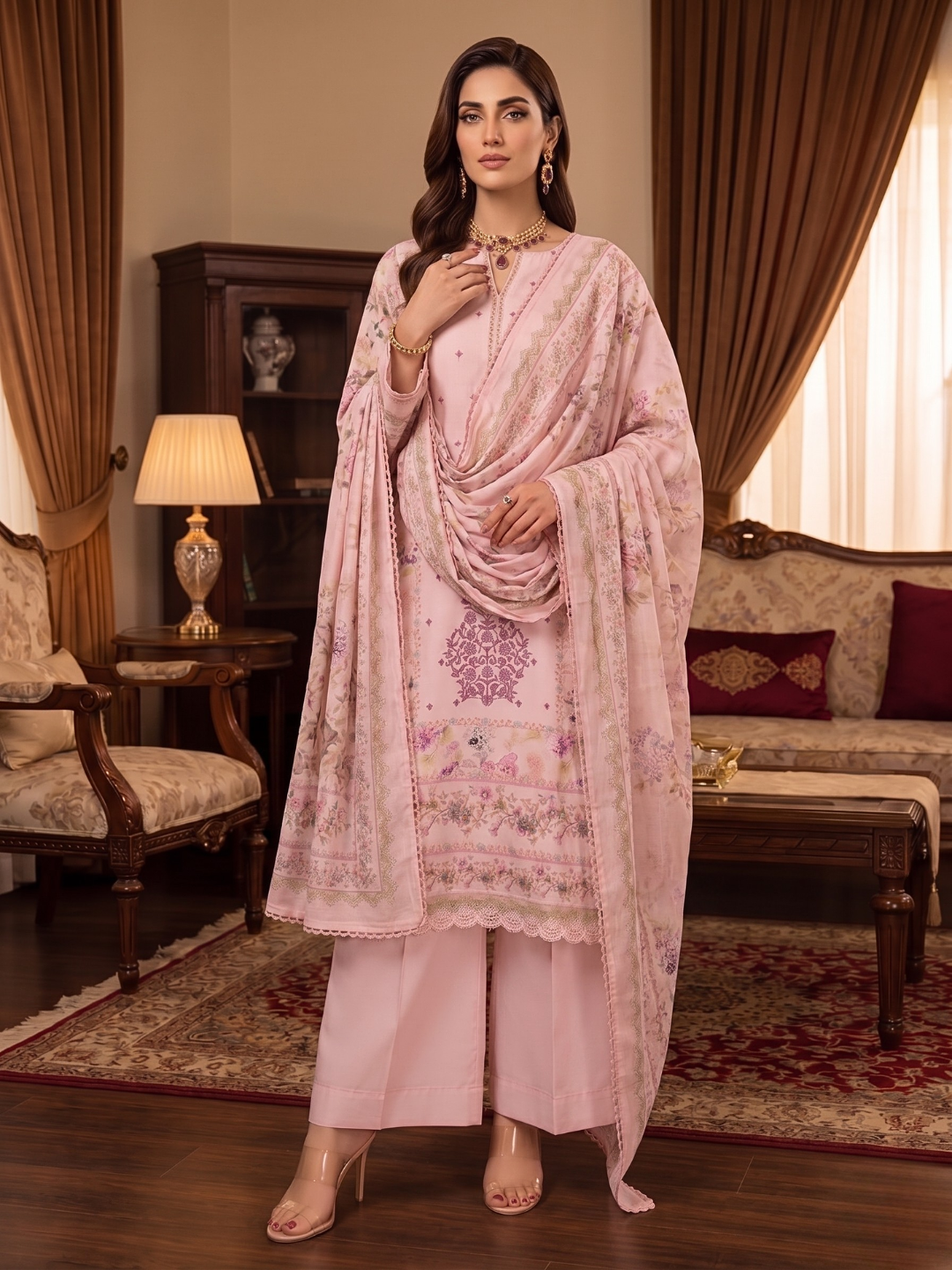 Dupatta: Flowing muslin dupatta finished with elegant four-side lace, adding charm to every movement.