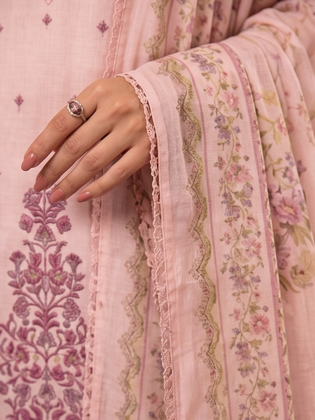 Shirt: Muslin fine fabric adorned with delicate embroidery, blending tradition with trend.