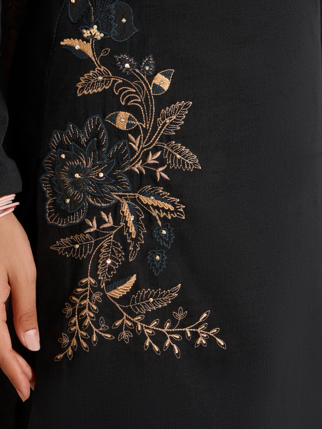 Shirt: Premium corduroy printed shirt featuring elegant multi thread embroidery and handwork on front. (Length: 2.50 meters)