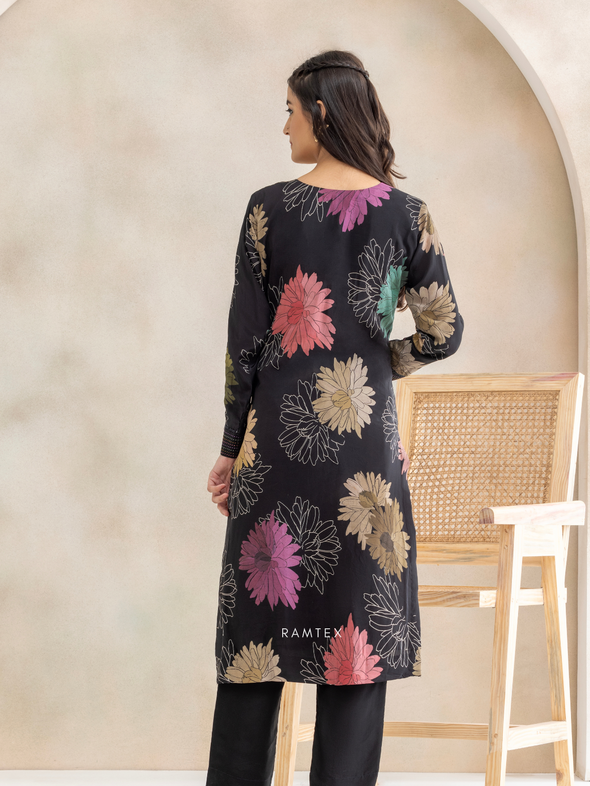 Shirt: Beautifully printed crepe shirt highlighted with delicate hand embroidery and intricate thread work along the borders and print on the back. (Length: 2.50 meters)