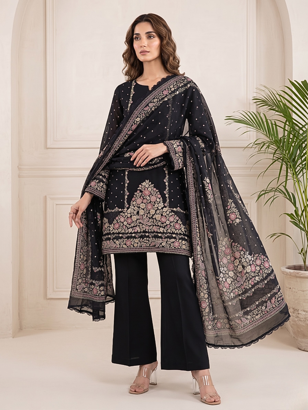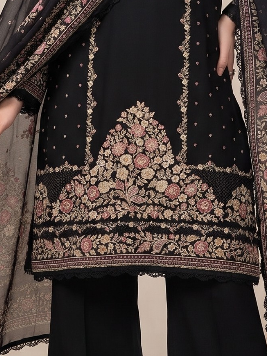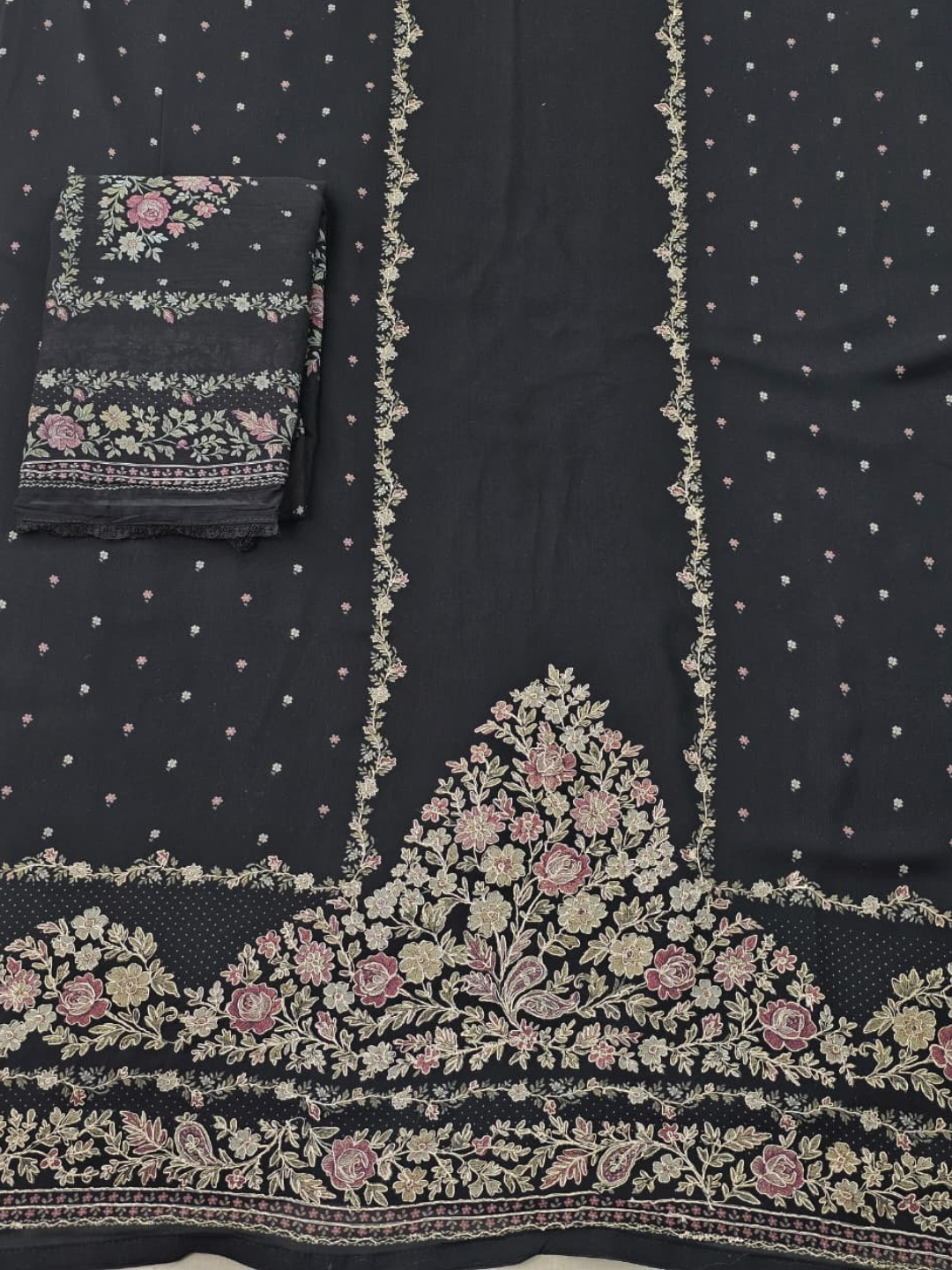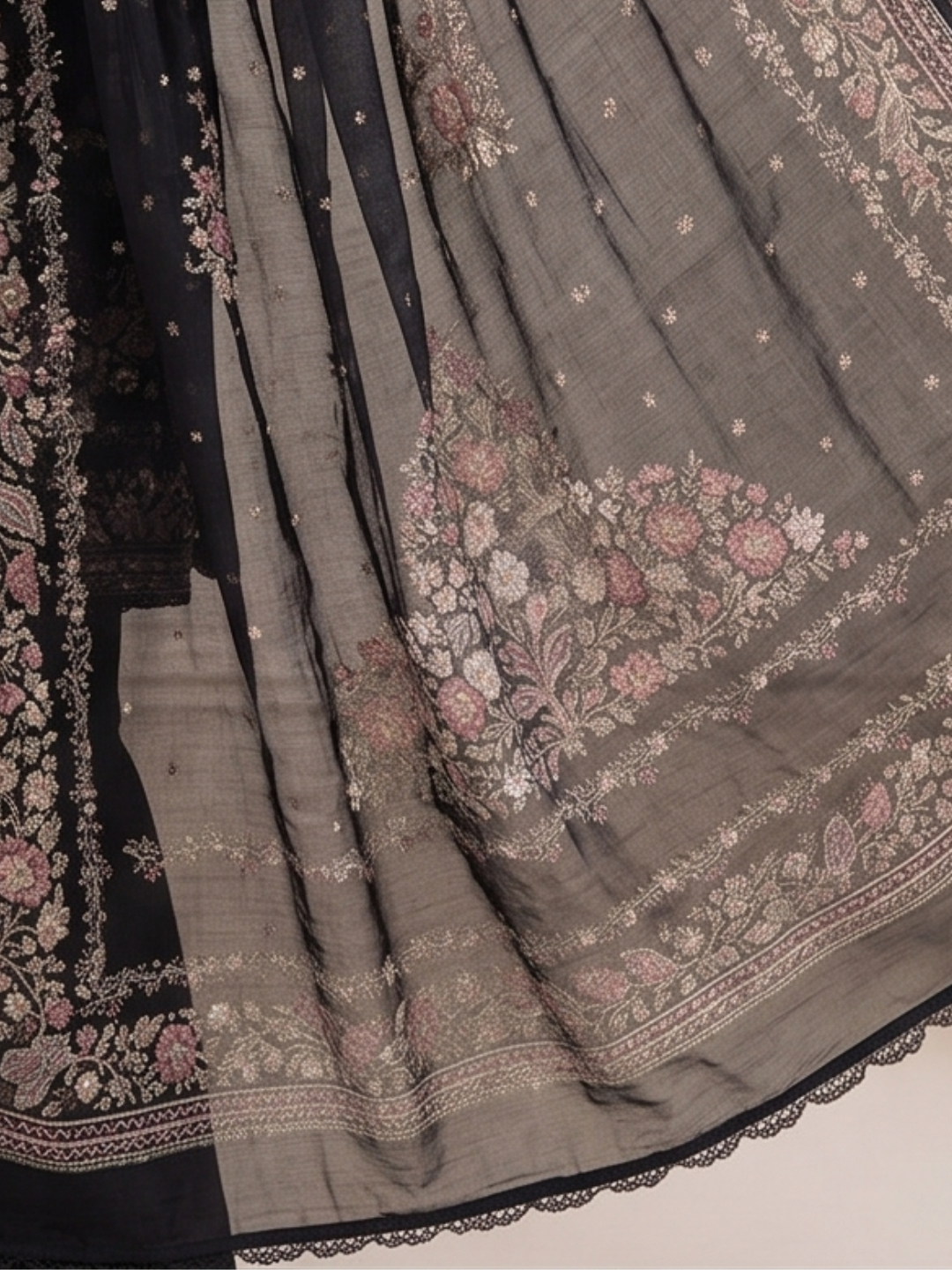 Bottom: Soft, plain crepe bottom offering unmatched comfort and graceful drape. (Length: 2.75 meters)