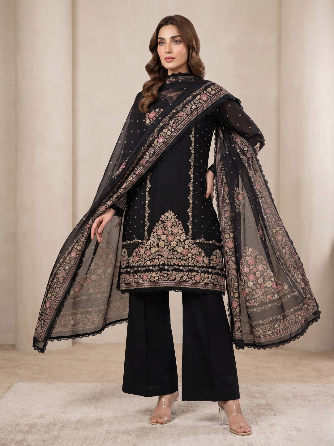 Dupatta: Flowing georgette digitally printed dupatta finished with elegant four-side lace, adding charm to every movement. (Length: 2.40 meters)