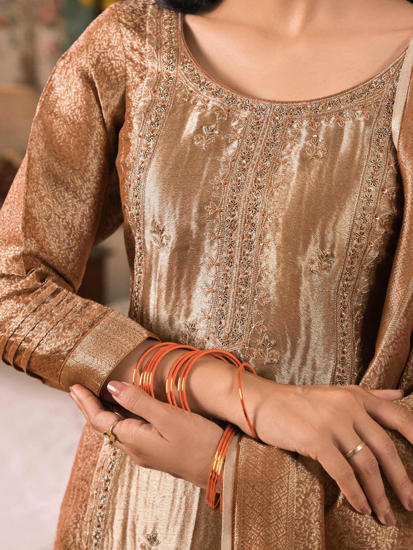 Shirt: Crafted from luxurious Jamawar silk jacquard fabric, the shirt features elegant golden embroidery on the front panel. (Length: 2.50 meters)