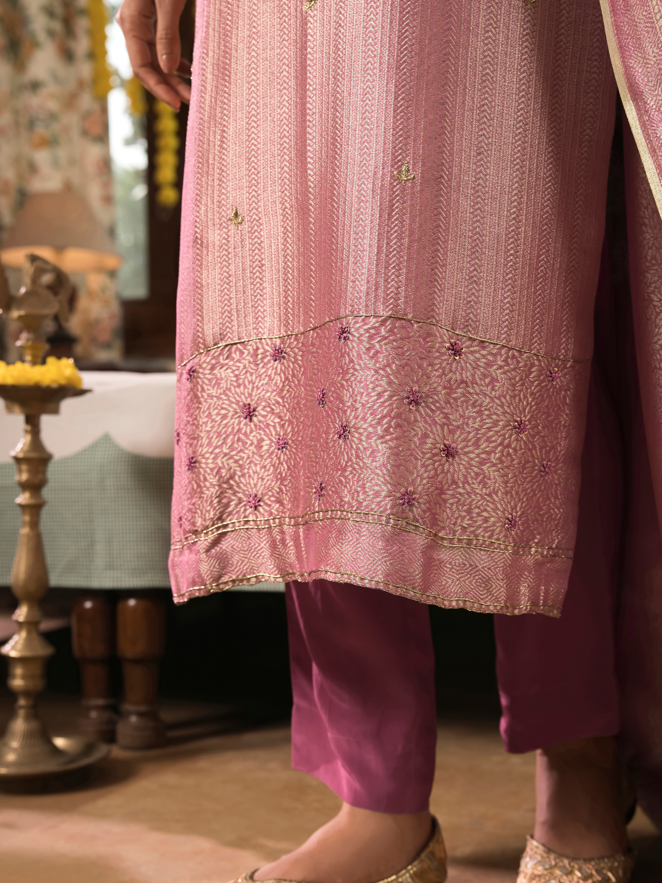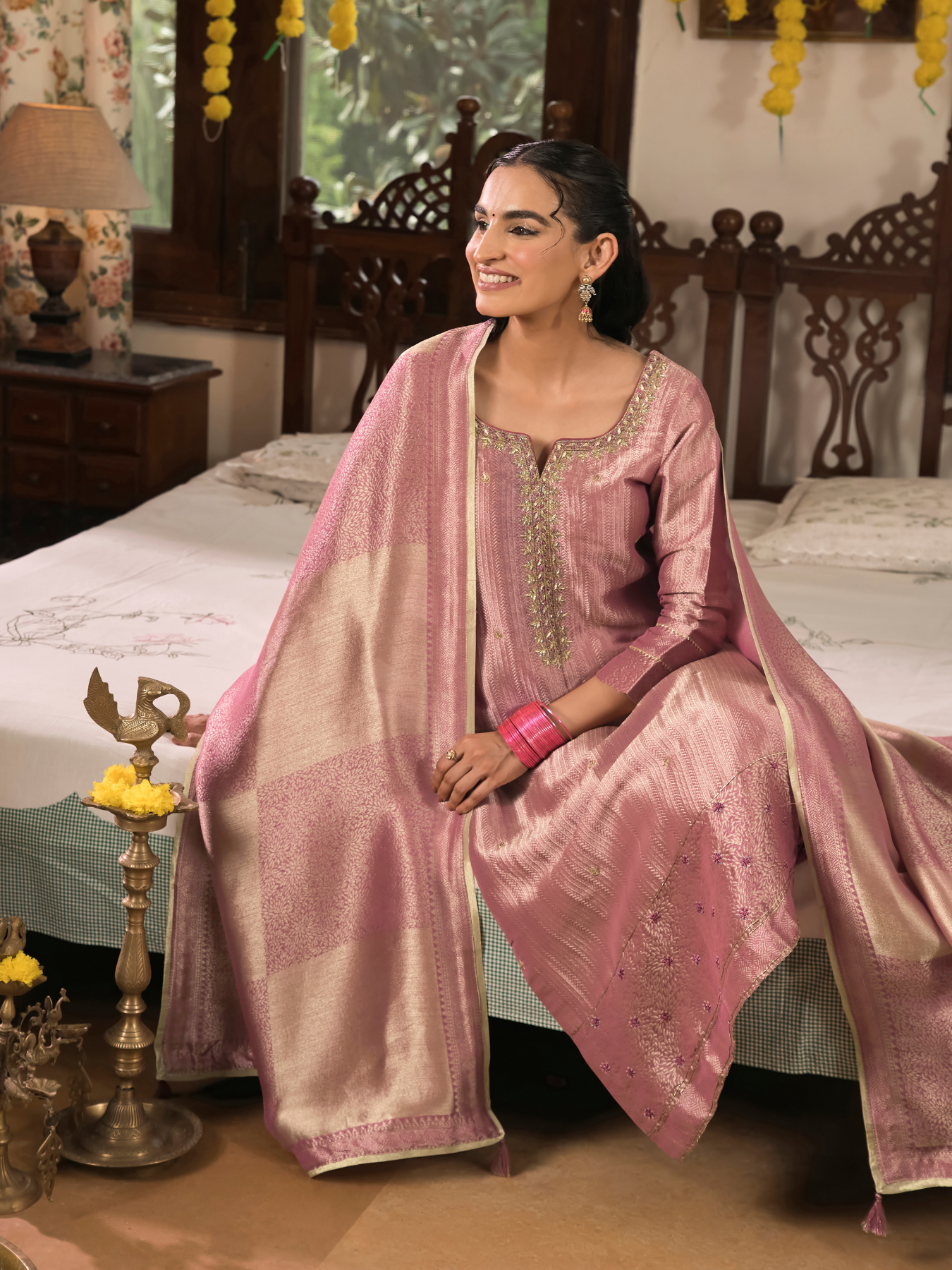 Shirt: Crafted from luxurious Jamawar silk jacquard fabric, the shirt features elegant golden embroidery on the front panel. (Length: 2.50 meters)