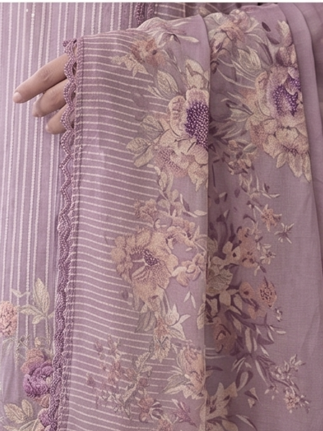 Dupatta: Chiffon printed designer dupatta finished with delicate all side lace.(Length: 2.50 meters)