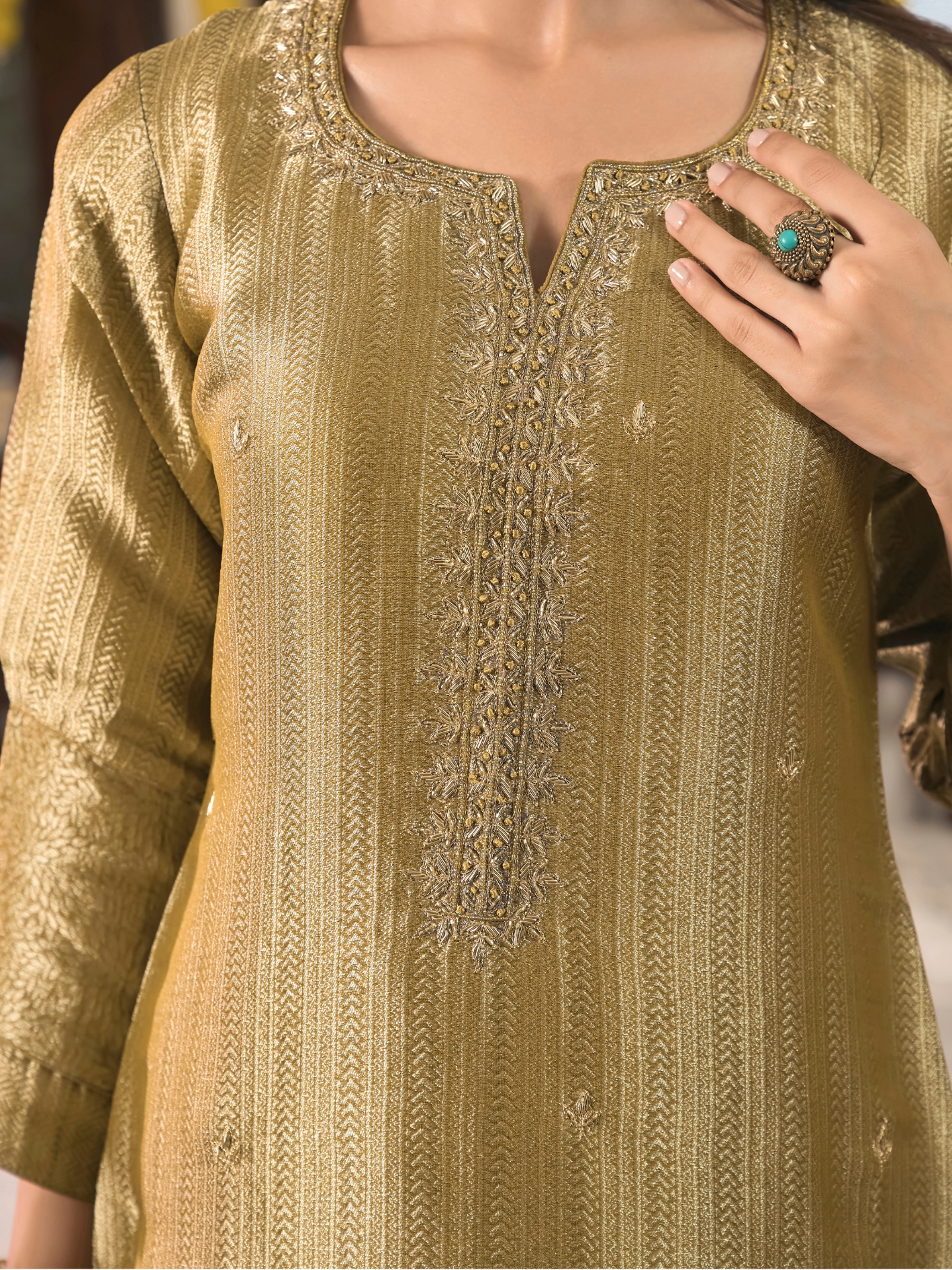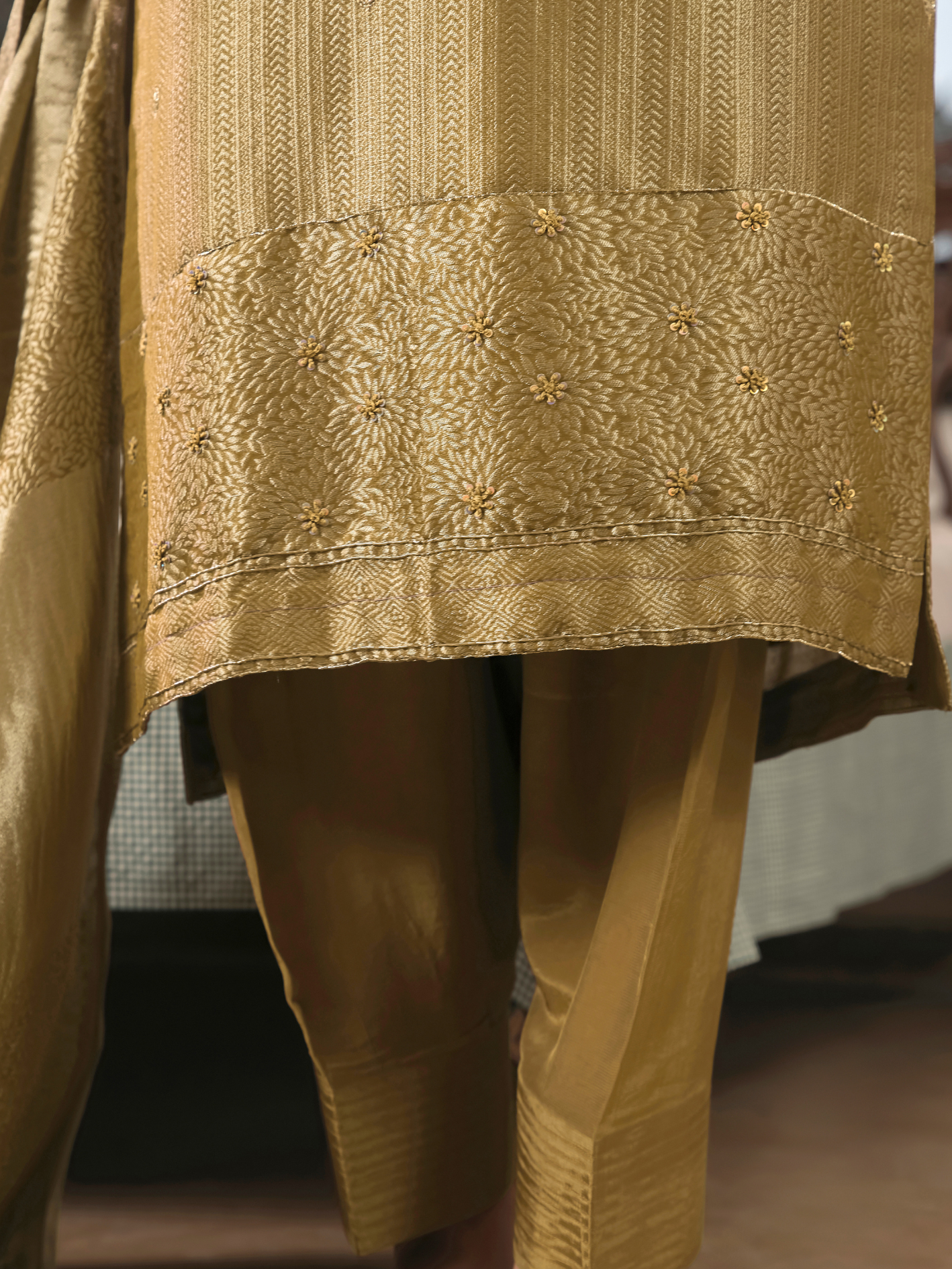 Shirt: Crafted from luxurious Jamawar silk jacquard fabric, the shirt features elegant golden embroidery on the front panel. (Length: 2.50 meters)