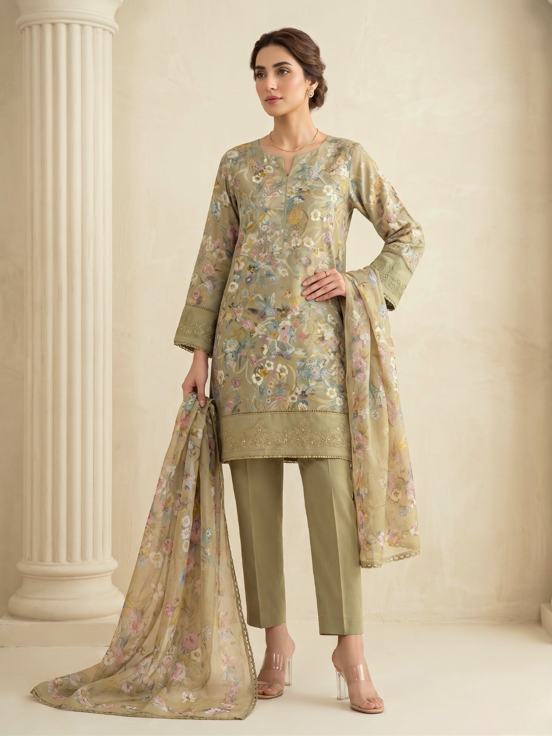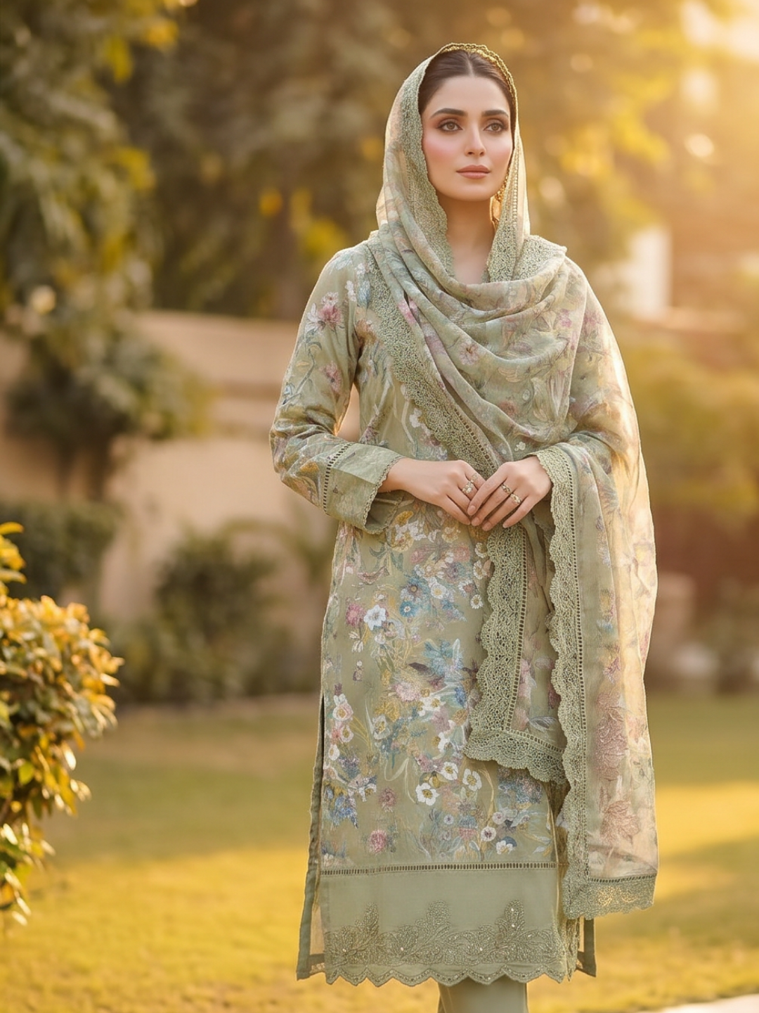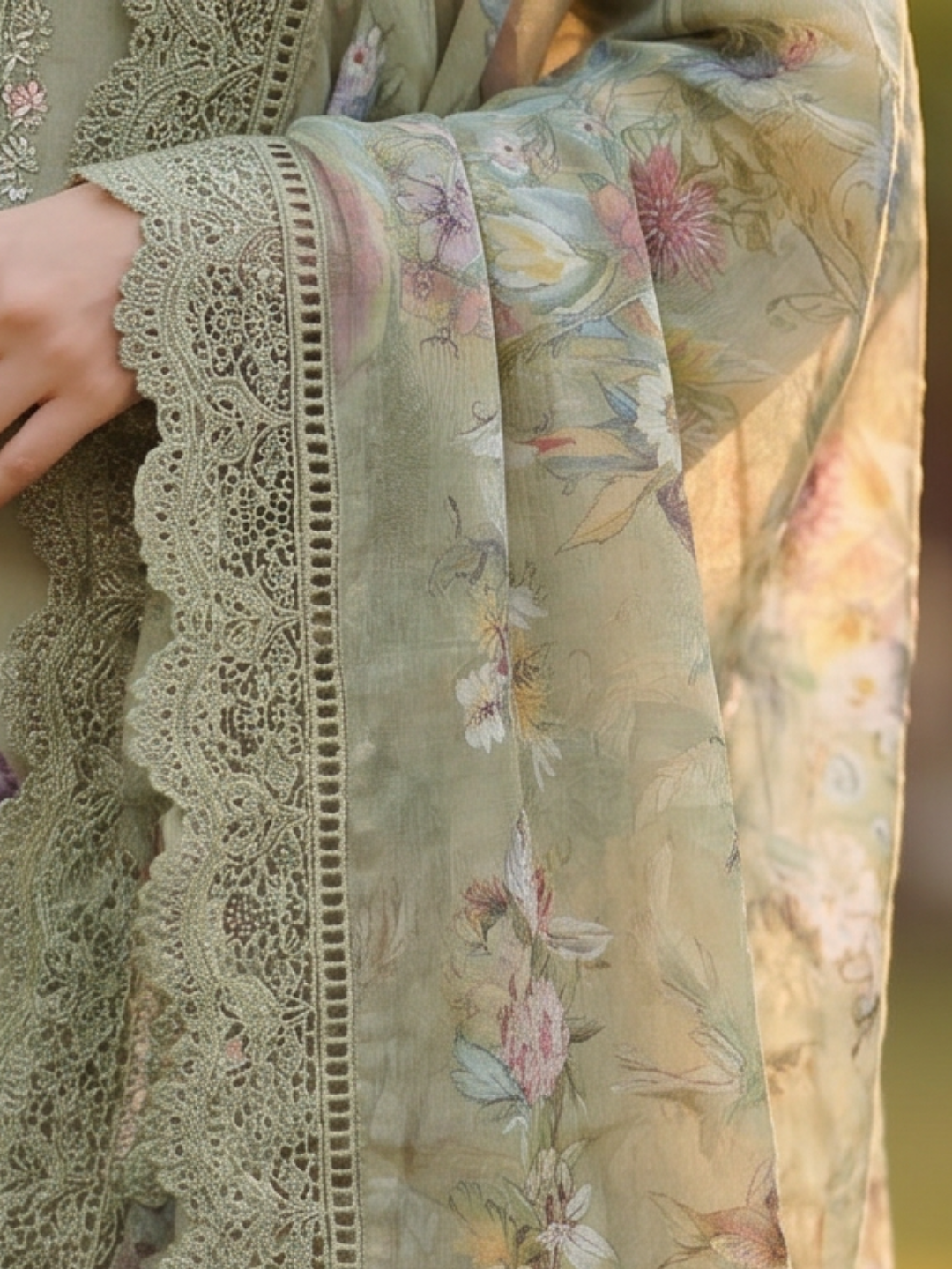 Dupatta: Designer chiffon printed dupatta, with all side lace. (Length: 2.35 meters)
