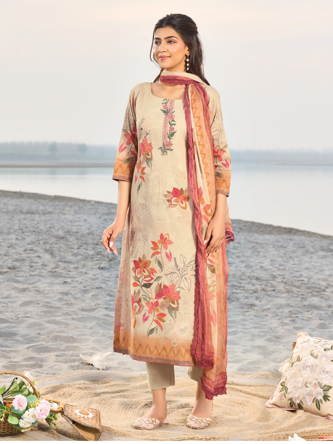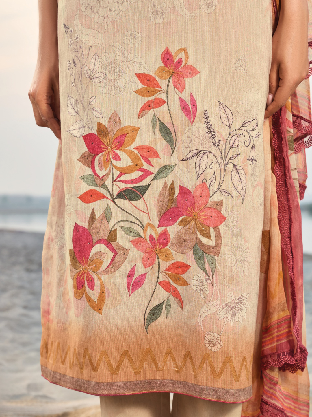 Dupatta: Chiffon printed designer dupatta finished with delicate all side lace. (Length: 2.50 meters)