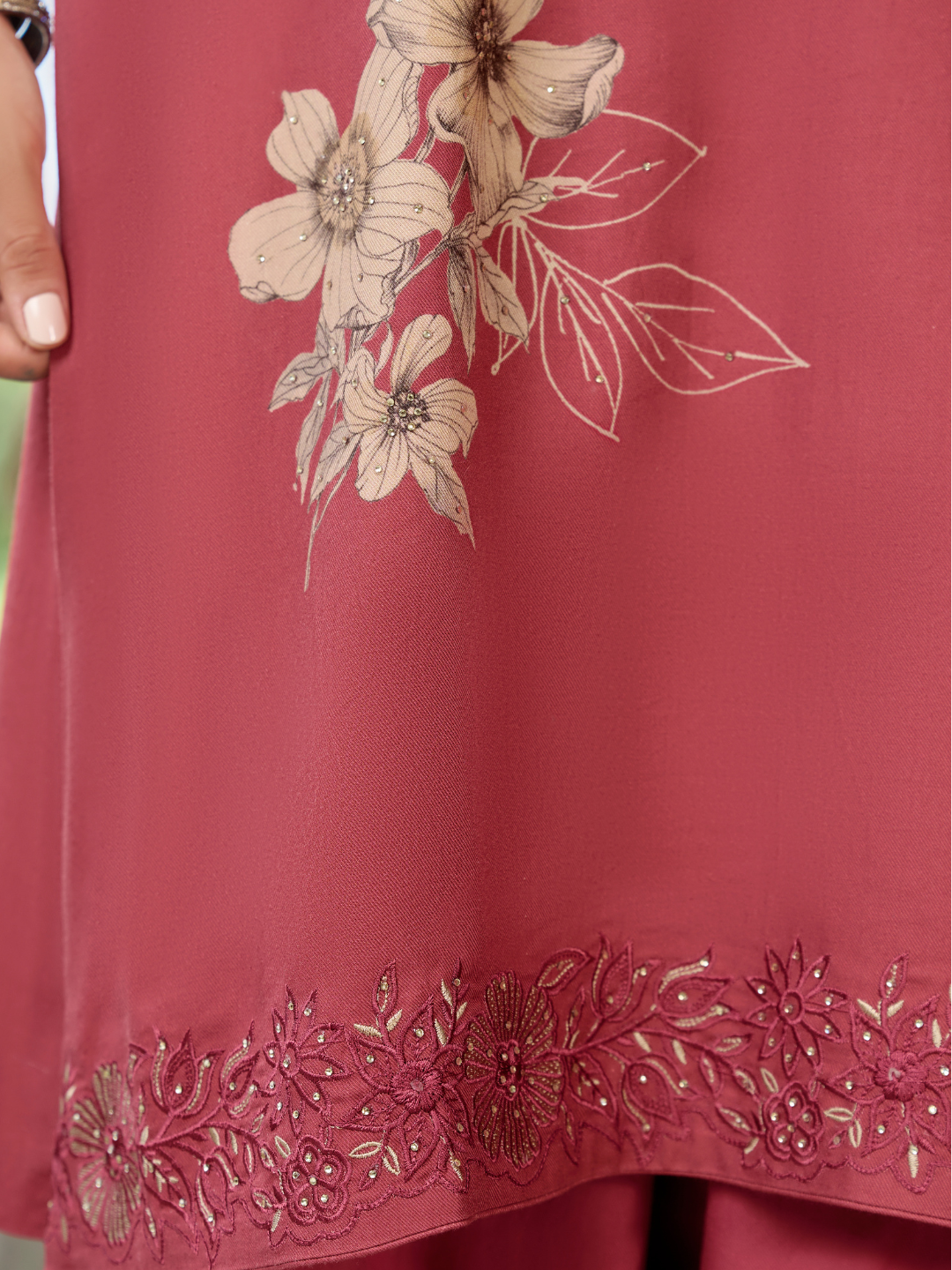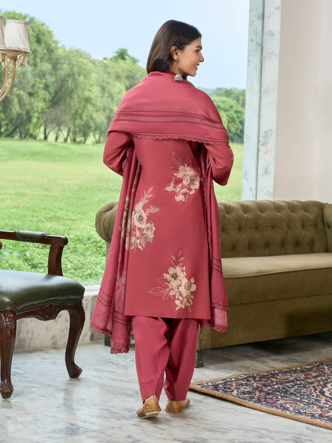 Rouge Pink Printed Cottswool Embroidered Unstitched Suit Set with Shawl