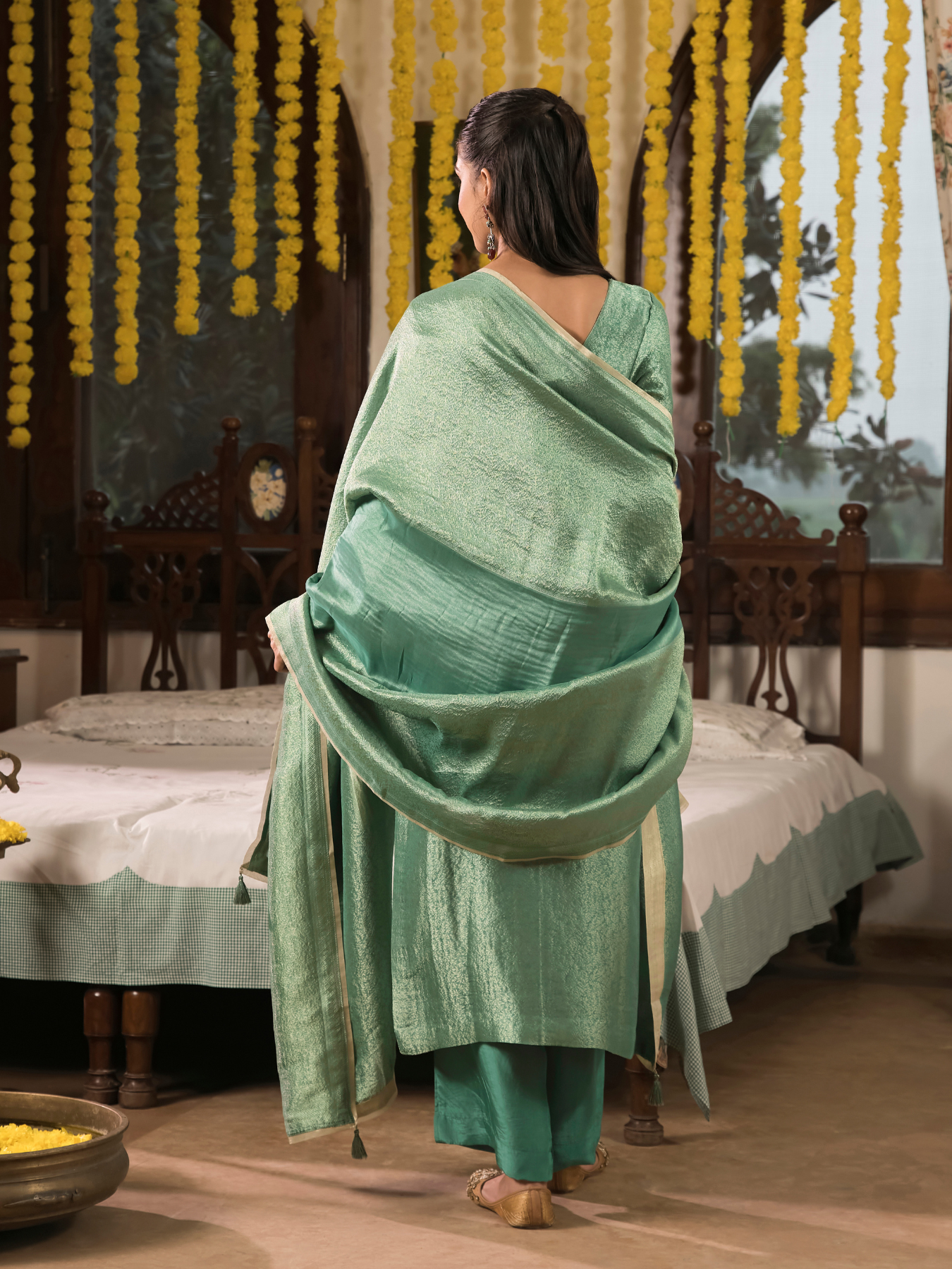 Dupatta: Jamawar silk jacquard dupatta beautifully finished with all-side tassels. (Length: 2.40 meters)