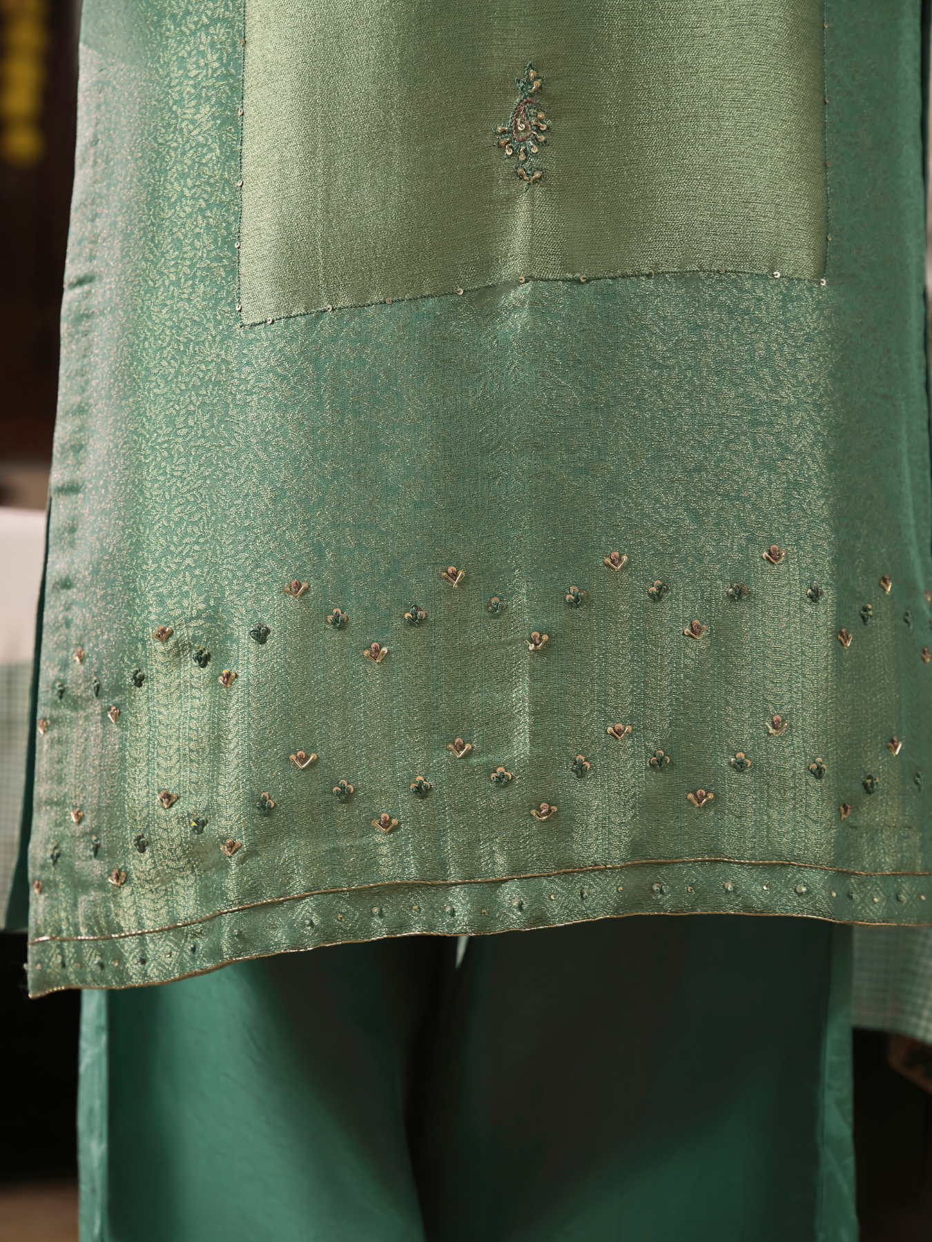 Shirt: Crafted from luxurious Jamawar silk jacquard fabric, the shirt features elegant golden embroidery on the front panel. (Length: 2.50 meters)