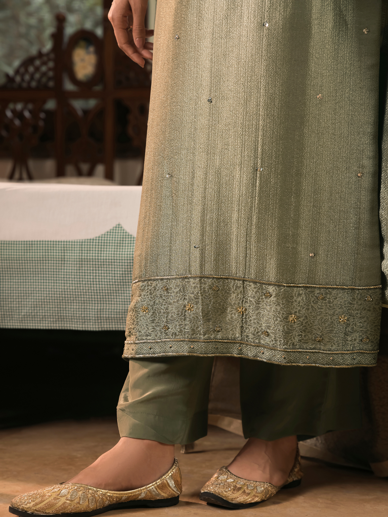 Olive Jamawar Silk Unstitched Suit Set with Golden Embroidery