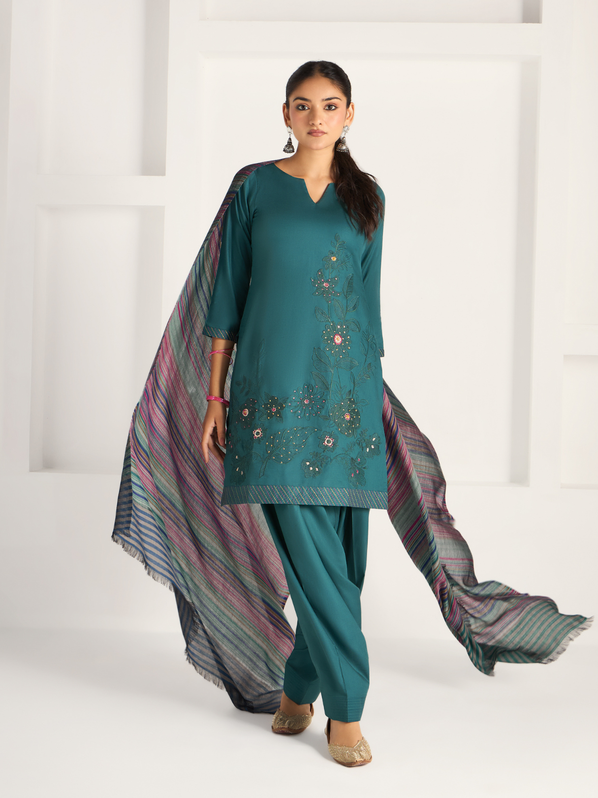 Shirt: Made from premium pure wool fabric, this shirt features beautiful multi-thread embroidery on the front, highlighted with delicate handwork. The plain back adds a clean and elegant look. (Length: 2.50 m)