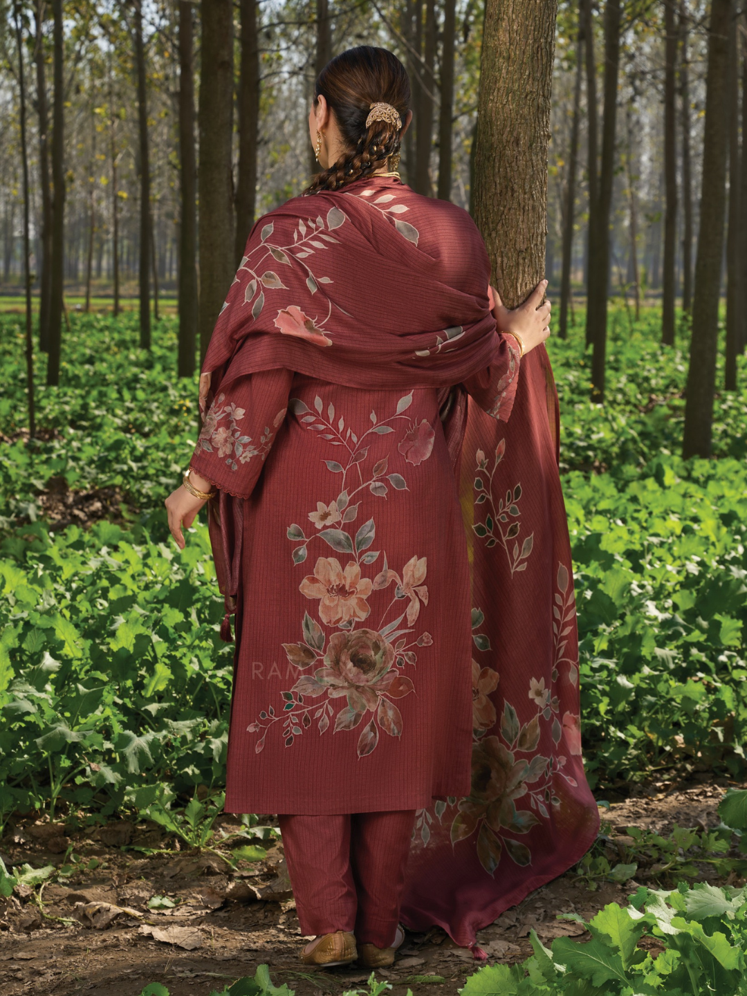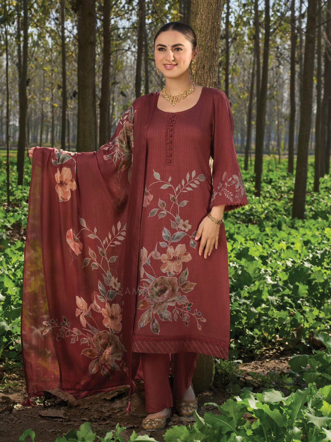Antique-Rust Printed Cottswool Embroidered Unstitched Suit Set with Shawl