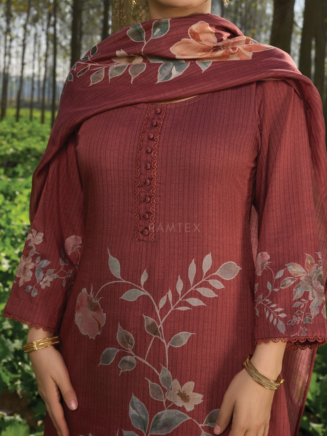 Shirt: Premium printed cottswool with delicate embroidery with buttons and lace detailing on the borders, finished with printed sleeves and back. (Length: 2.50 meters)
